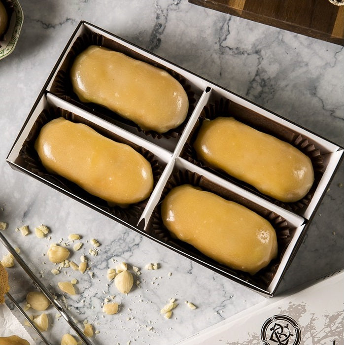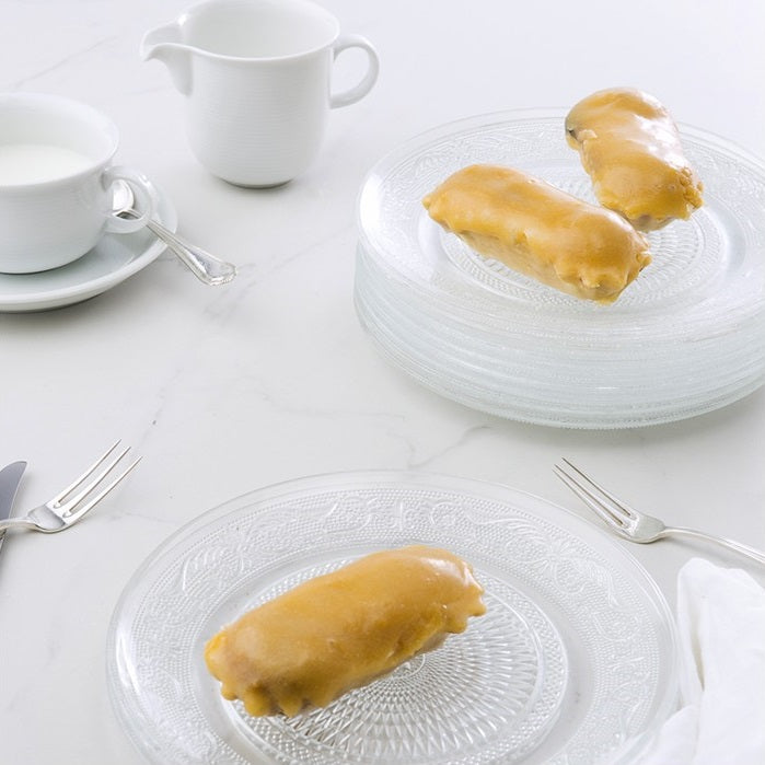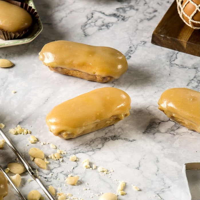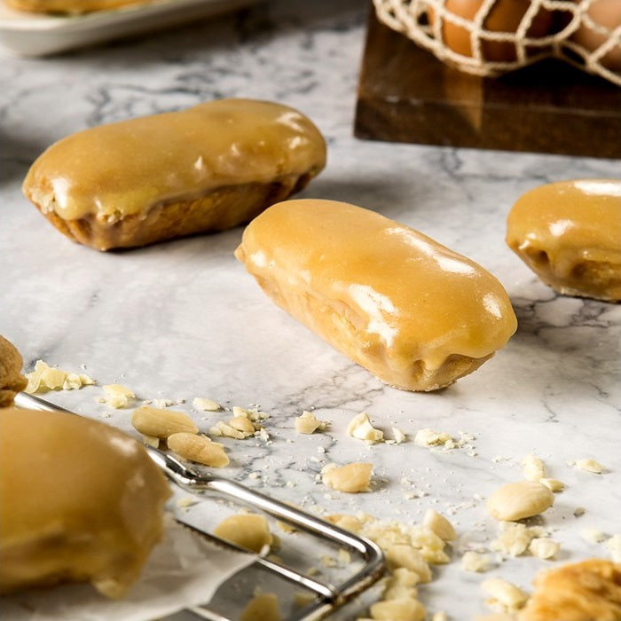Base de hojaldre, cubierta de una crema artesana de almendra Marcona, bañado en una capa de yema y terminado con un baño de azúcar que le aporta el aspecto brillante y el sabor crujiente.
